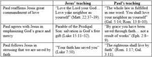 Critics assert that Paul who has never met the historical Jesus during His earthly ministry felt free to reinvent Christianity. Paul readily transformed the earthy moral teachings of Jesus, the rustic Galilean moral teacher, into a totally new religion centred on Jesus’ death and resurrection and his glorification into a transcendent divine savior. However, Paul’s teachings consistently reflect the teachings of Jesus as is made clear in the examples given in the table below.