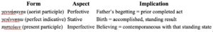• In 1 John 5:1, believing (πιστεύων) is a present participle — aspectually imperfective and contemporaneous.