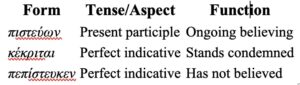• In John 3:18, not-believing (πεπίστευκεν) is a perfect indicative — aspectually stative and already settled.